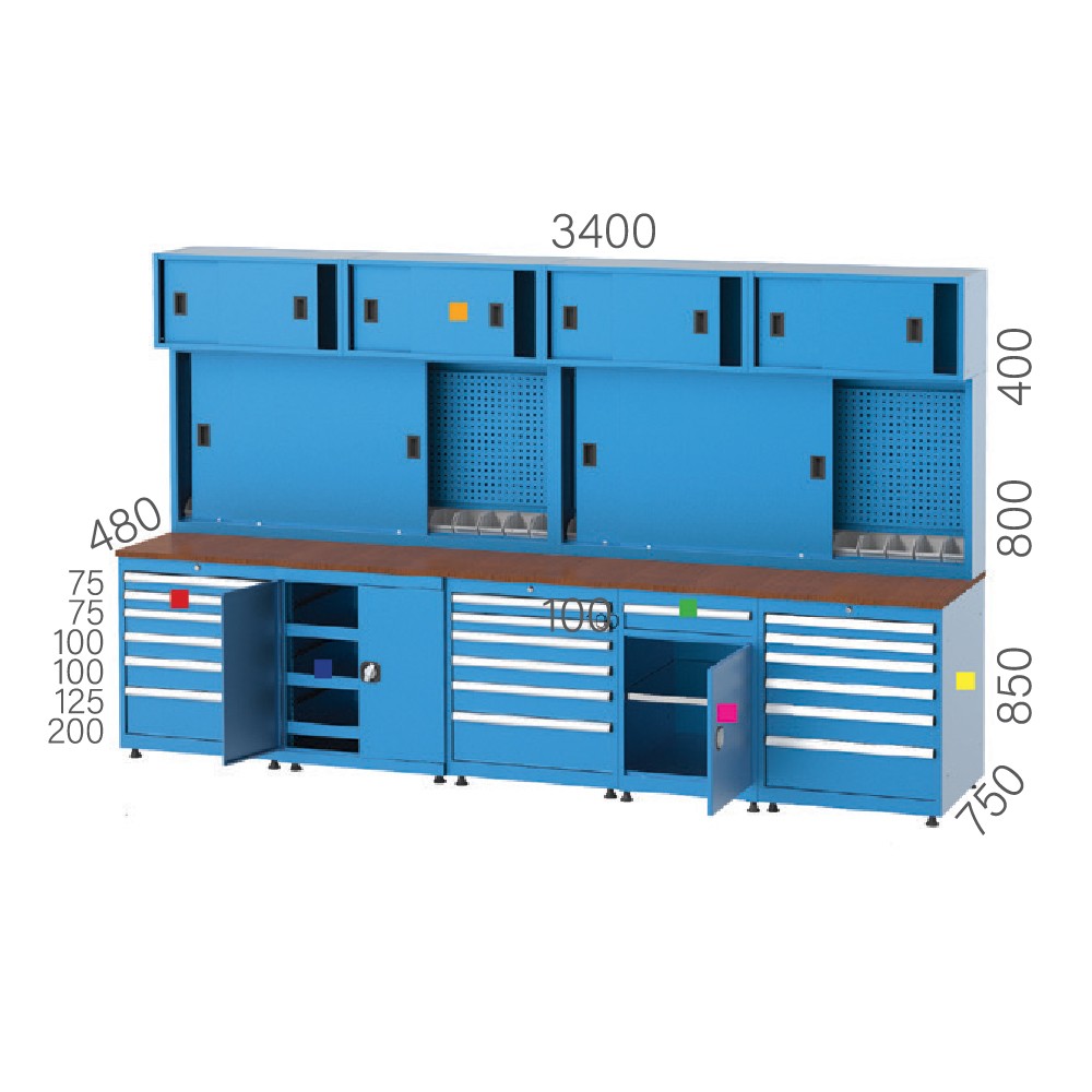 19 çekmeceli, 5 dolaplı, sürgü kapılı askı panolu ve 4 klasör dolaplı çalışma tezgahı kullanım amaçlarına göre fonksiyonel özellkler ilave edilerek en verimli ve pratik çalışma ortamını sağlar. Demonte edilebilir özelliği bulunan çalışma tezgahı modelleri sevkiyatta ve kurulumda kolaylık sağlar. Uzun tip çalışma tezgahı üzerinde bulunan çekmecelerin sayıları isteğe ve kullanıma bağlı olarak revize edilebilir. Masa üst zeminleri isteğe bağlı olarak, 2 mm siyah pvc, galvaniz sac veya paslanmaz sac kaplama seçenekleriyle de kullanılabilir. Çalışma tezgahı üzerinde bulunan masanın altına farklı çekmece alternatifli dolaplar eklenebilir.