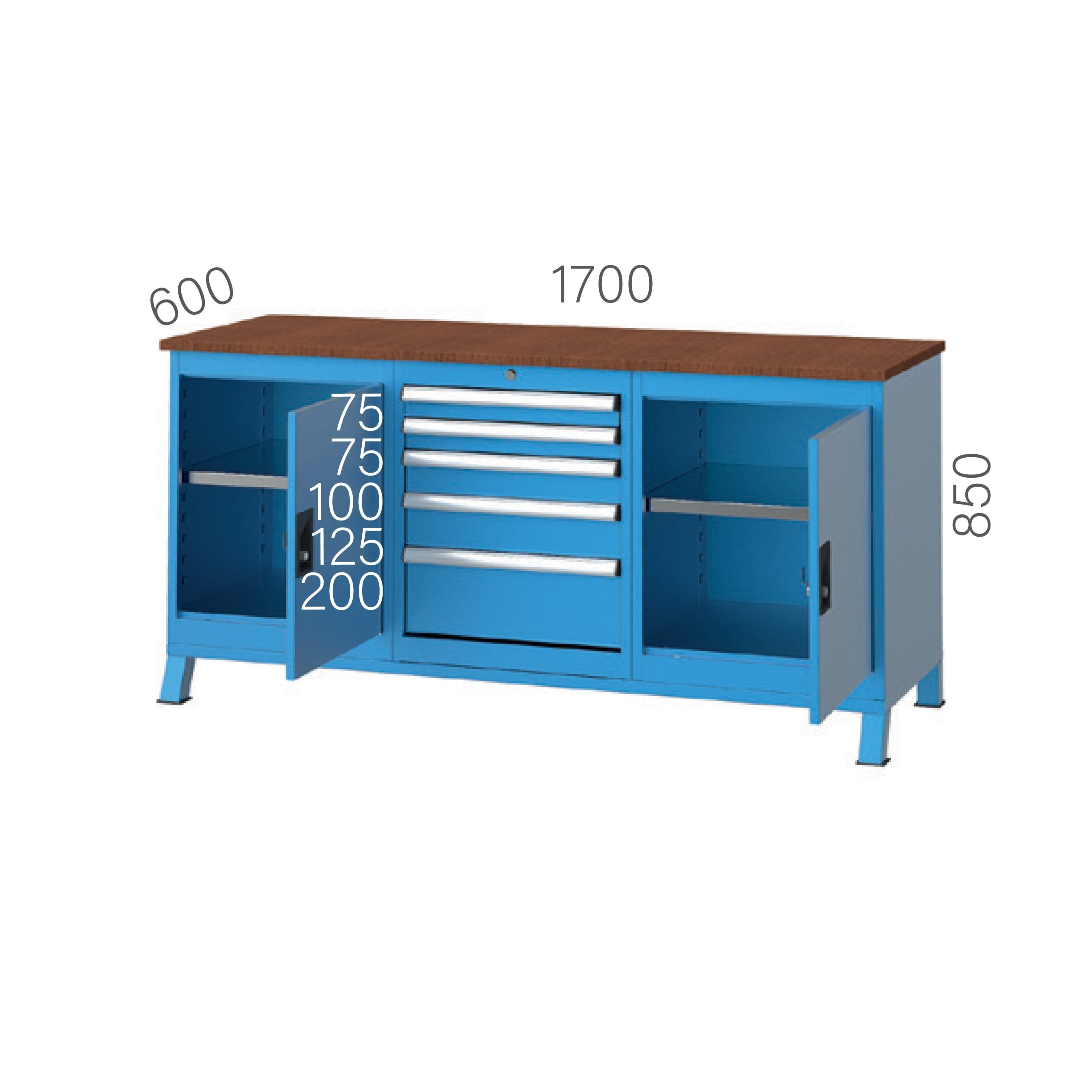 5 çekmeceli, 2 dolaplı çalışma tezgahları kullanım amaçlarına göre fonksiyonel özellkler ilave edilerek en verimli ve pratik çalışma ortamını sağlar. Demonte edilebilir özelliği bulunan çalışma tezgahı modelleri sevkiyatta ve kurulumda kolaylık sağlar.İstenildiğinde takım asma panosu, florasan ve elektrik panosu ilave edilebilir. Masa üst zeminleri isteğe bağlı olarak, 2 mm siyah pvc, galvaniz sac veya paslanmaz sac kaplama seçenekleriyle de kullanılabilir.