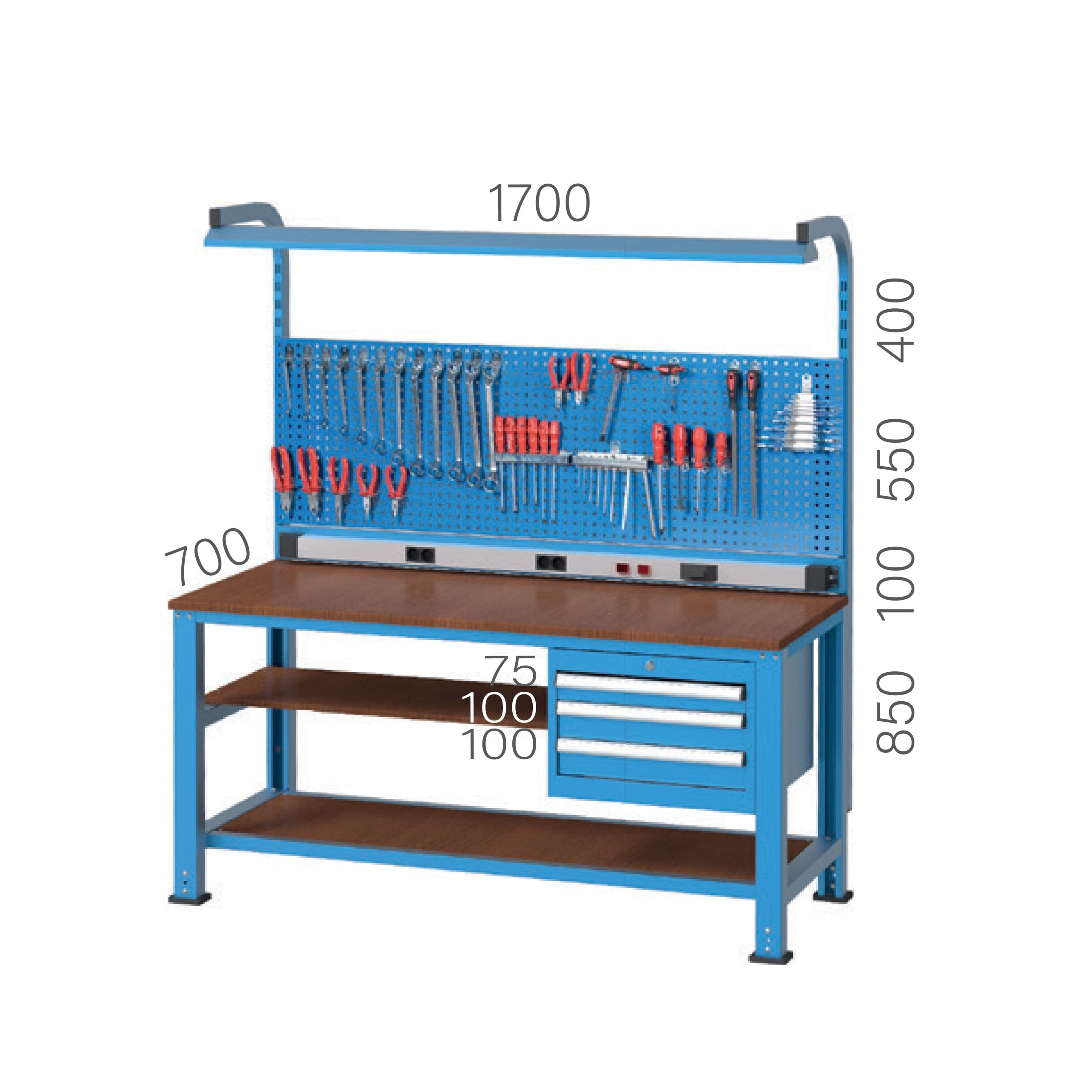 3 çekmeceli, takım asma panolu çalışma tezgahları kullanım amaçlarına göre fonksiyonel özellkler ilave edilerek en verimli ve pratik çalışma ortamını sağlar. Demonte edilebilir özelliği bulunan çalışma tezgahı modelleri sevkiyatta ve kurulumda kolaylık sağlar. İstenildiğinde takım asma panosu, florasan ve elektrik panosu ilave edilebilir. Masa üst zeminleri isteğe bağlı olarak, 2 mm siyah pvc, galvaniz sac veya paslanmaz sac kaplama seçenekleriyle de kullanılabilir.