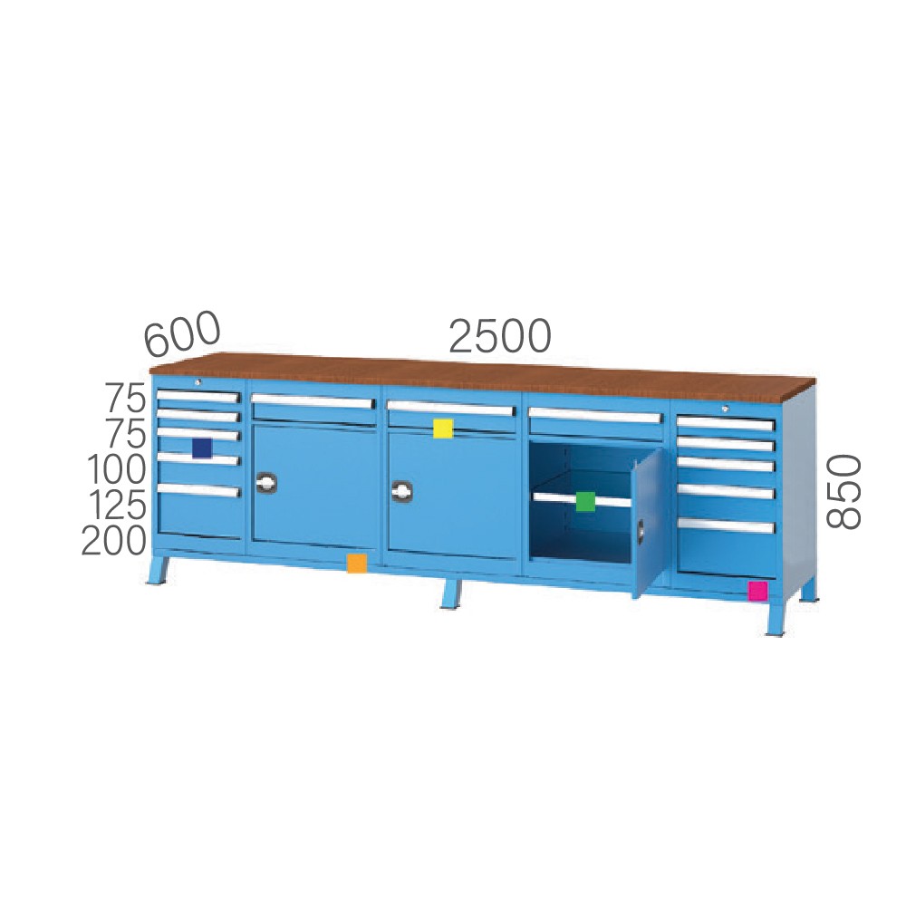 13 çekmeceli, uzun tip çalışma tezgahları kullanım amaçlarına göre fonksiyonel özellkler ilave edilerek en verimli ve pratik çalışma ortamını sağlar. Demonte edilebilir özelliği bulunan çalışma tezgahı modelleri sevkiyatta ve kurulumda kolaylık sağlar. İstenildiğinde askı panosu, florasan ve elektrik panosu ilave edilebilir. Masa üst zeminleri isteğe bağlı olarak, 2 mm siyah pvc, galvaniz sac veya paslanmaz sac kaplama seçenekleriyle de kullanılabilir.