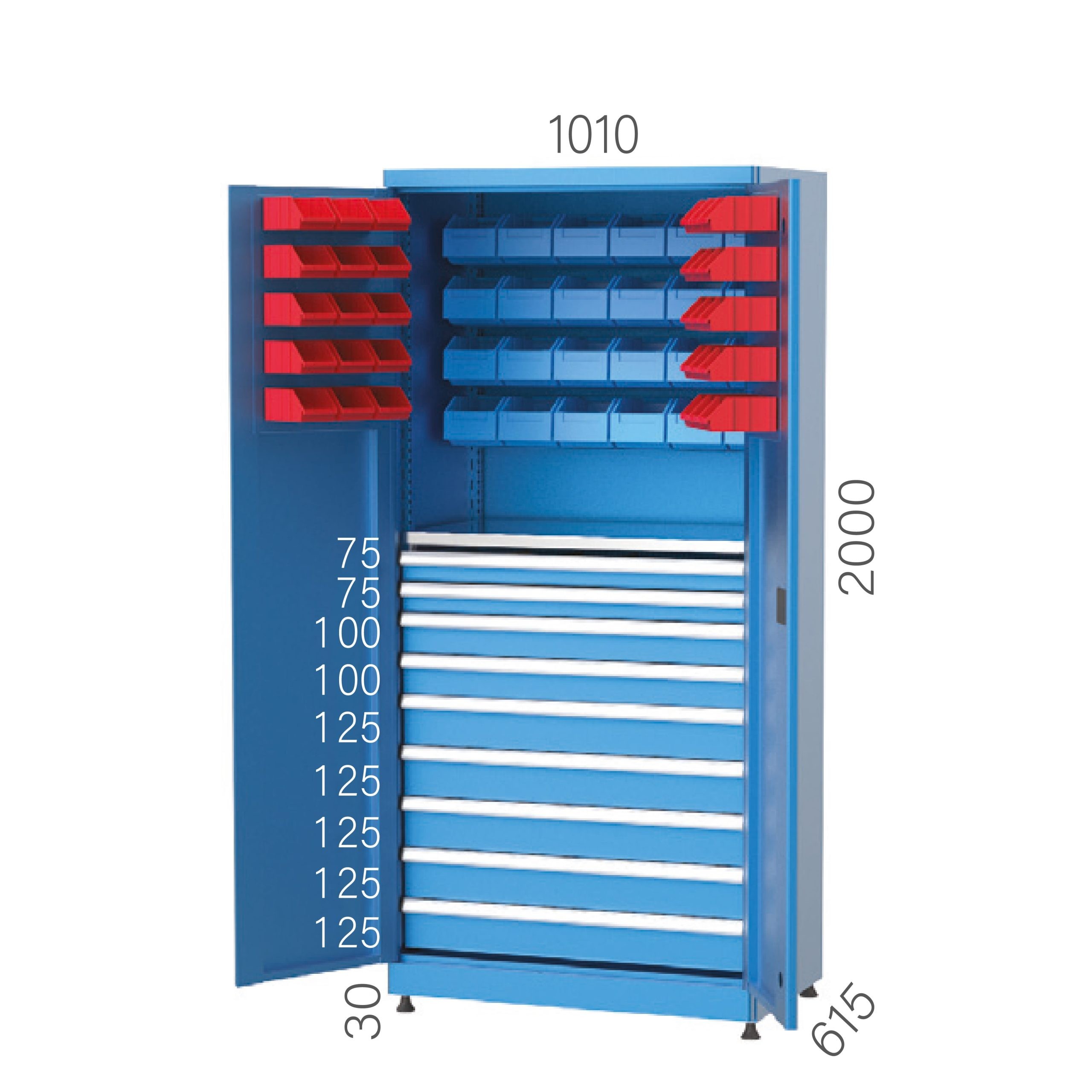 9 Çekmeceli, raflı, plastik kutulu ve kapılı endüstriyel dolabımız ; üretim hatlarında makine yedek parçalarının, ölçü aletlerinin ve takımların muhafaza edilmesi için tasarlanmıştır. Ayrıca dolabımızın içerisinde ve kapı içlerinde bulunan 54 adet plastik avadanlık kutularına, sınıflandırma yaparak küçük malzemelerinizi stoklayabilirsiniz.Kapılarda bulunan ispanyolet kilit sistemi sayesinde dolabımız 2 noktadan kilitlenmektedir.