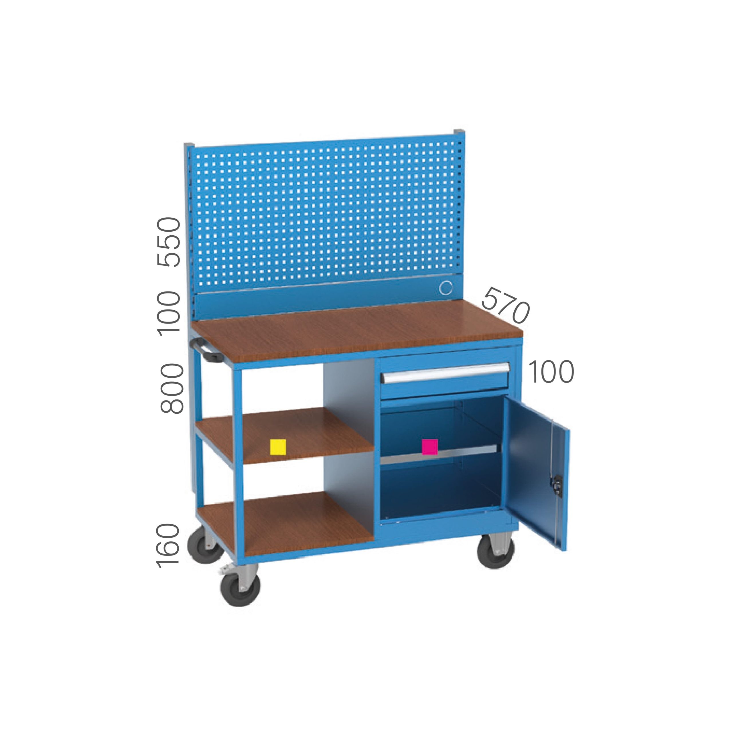 Takım asma panolu, 1 çekmeceli ve 1 raflı dolaplı çalışma arabamız sayesinde ; üretim alanlarında orta büyüklükteki malzemelerin bir yerden bir yere beden gücü harcanmadan sevki, aynı zamanda ilgili yedek parça ve el aletlerininde muhafazası sağlanmaktadır. İstenildiğinde çekmece sayısı artıırılabilir, masa üzerine isteğe bağlı olarak pvc, galvaniz sac veya paslanmaz sac kaplama yapılabilir.