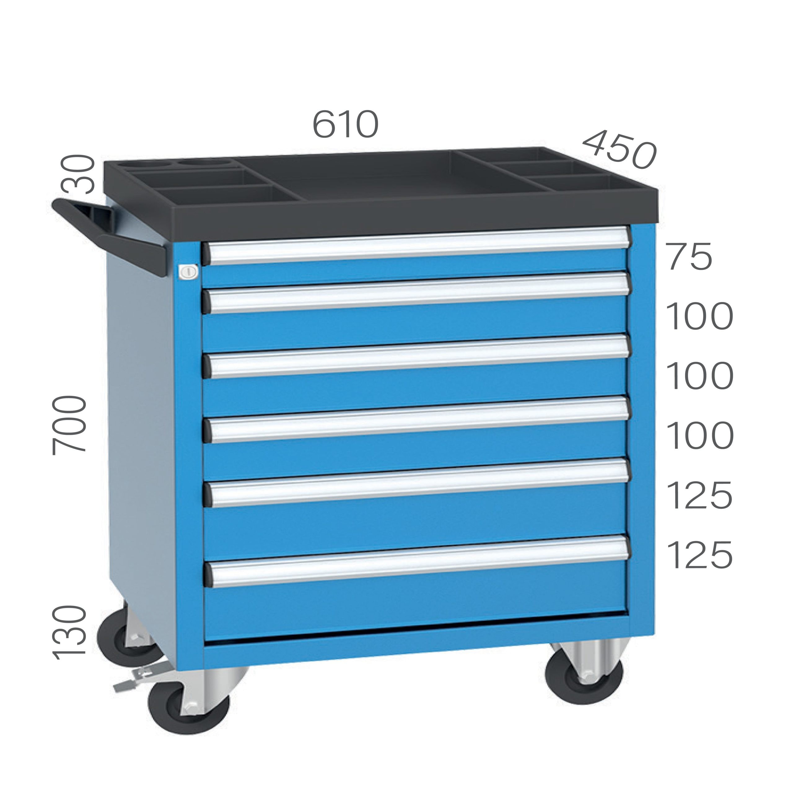 6 çekmeceli takım arabası ; atölye ortamlarında düzenli görünüm sağlar. Ayrıca fabrika ortamında elemanlara zimmetlenen takım ve el aletlerinin kaybını en aza indirmeyi amaçlar.