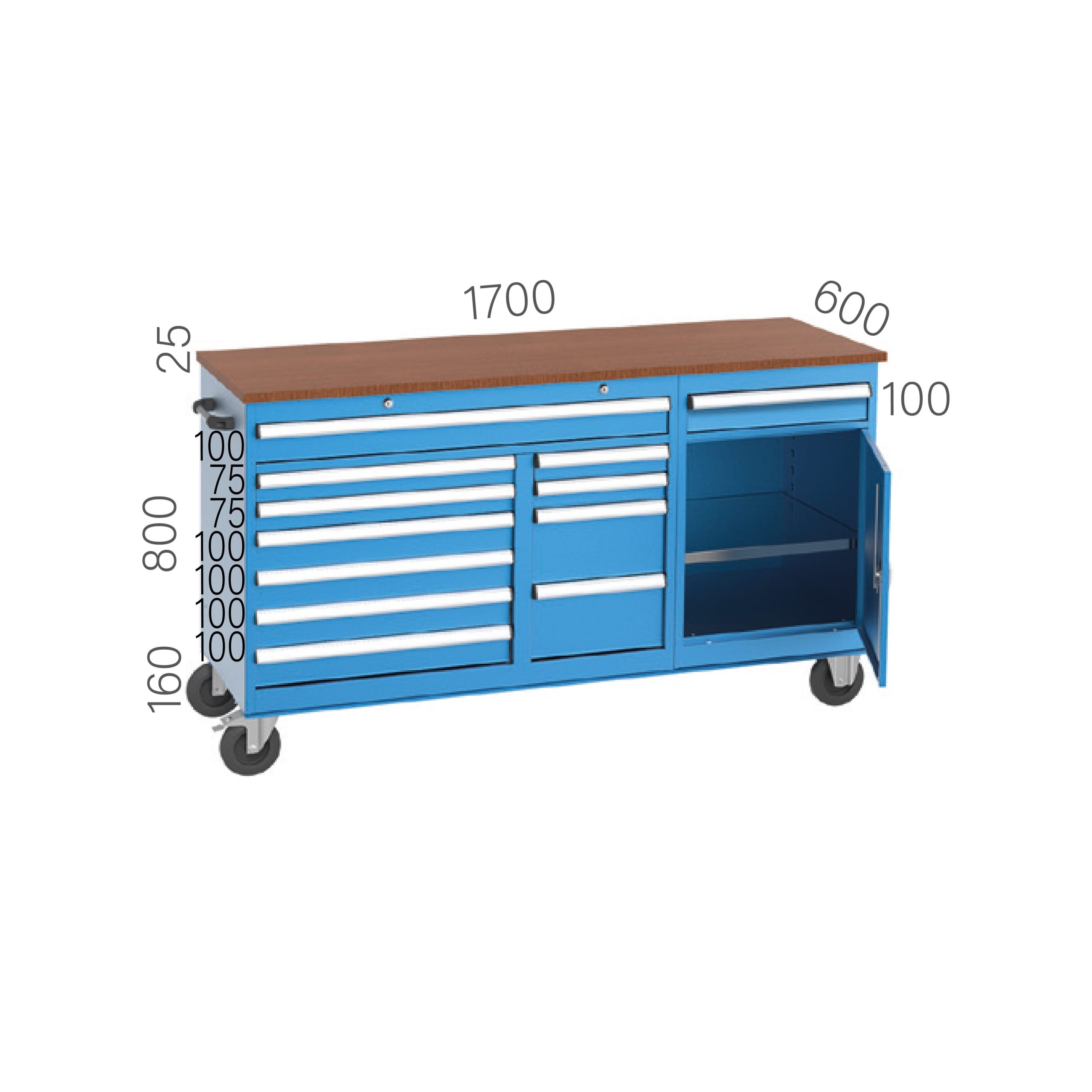 12 çekmeceli ve 1 raflı dolaplı çalışma arabamız sayesinde ; üretim alanlarında orta büyüklükteki malzemelerin bir yerden bir yere beden gücü harcanmadan sevki, aynı zamanda ilgili yedek parça ve el aletlerininde muhafazası sağlanmaktadır. İstenildiğinde çekmece sayısı artıırılabilir, masa üzerine isteğe bağlı olarak pvc, galvaniz sac veya paslanmaz sac kaplama yapılabilir.
